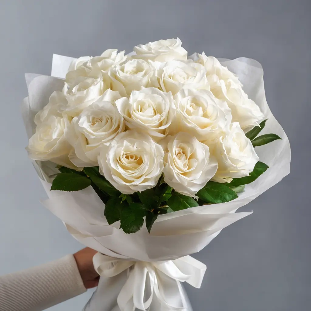 Изысканный букет из белых роз, словно пропитанный молочной мягкостью. Идеален для признания в уважении, благодарности или для подарка на утро свадьбы. Белые розы подчеркивают чистоту и деликатность момента.