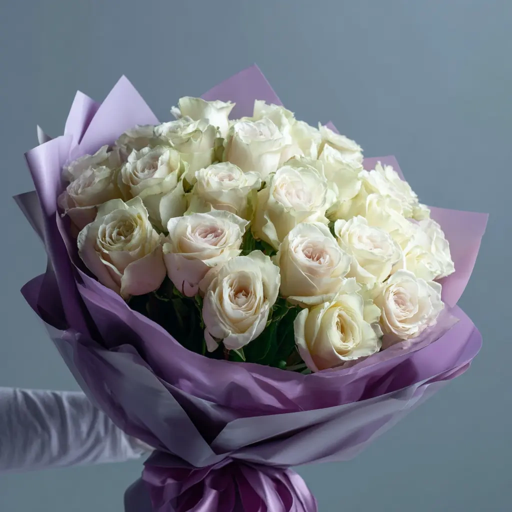 Мягкий и тёплый букет, навеянный атмосферой вечернего покоя. Белые розы создают уютное и гармоничное настроение. Идеален для романтического жеста или признательности.