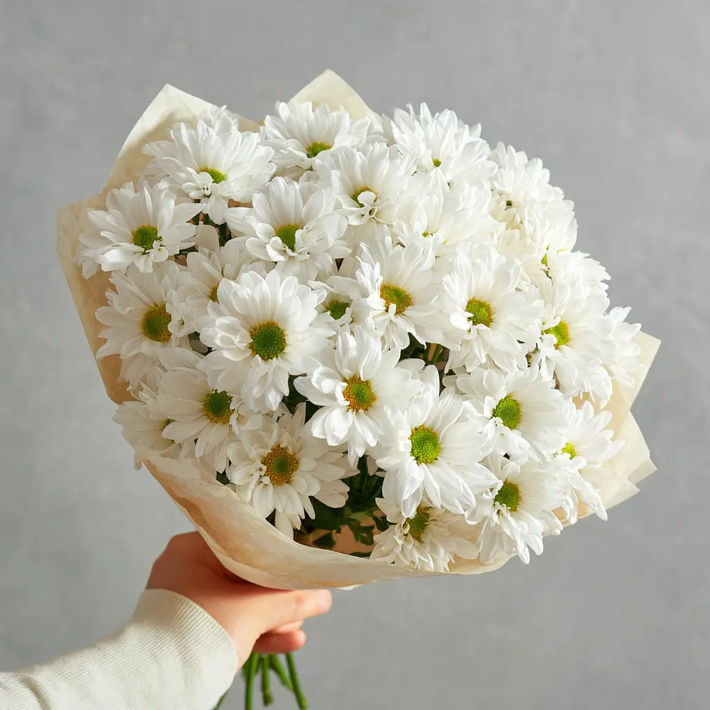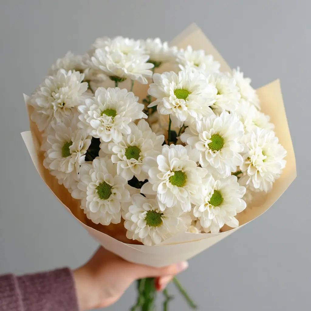 Чистый и сдержанный букет с белыми хризантемами — выбор для универсального подарка. Он символизирует уважение, искренность и заботу. Подходит для любого повода: от благодарности до делового поздравления.