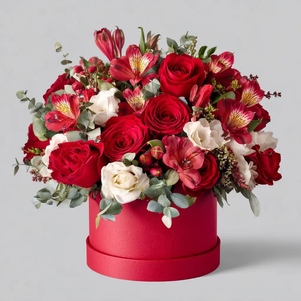 Красные розы, белая альстромерия и зелень эвкалипта — идеальный букет для романтического настроения и особых моментов.