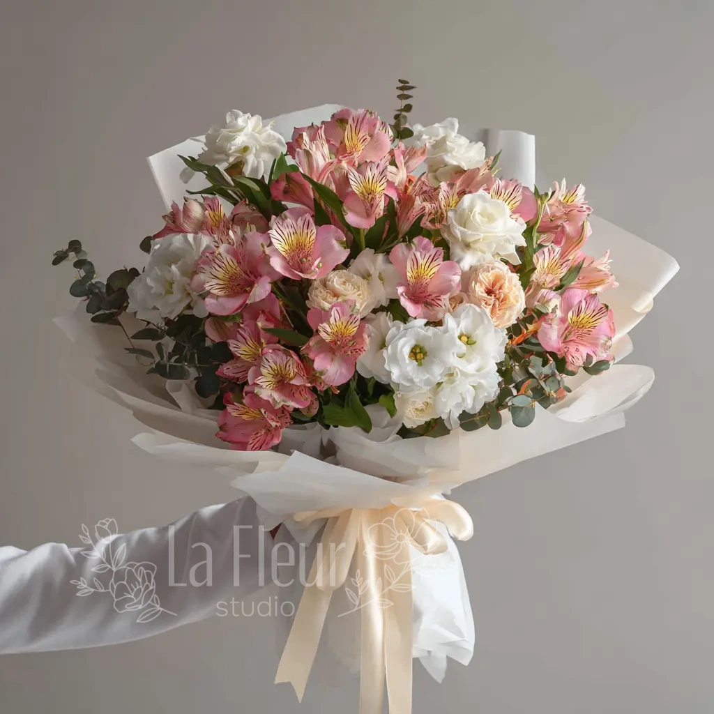 Живой, динамичный букет с пёстрыми альстромериями в изящной композиции. Цветы словно кружатся в танце, передавая лёгкость, радость и вдохновение. Универсальный подарок для женщин любого возраста.