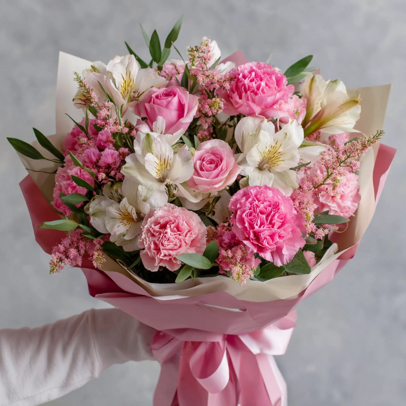 Пушистые розовые гвоздики с зеленью — игривый и романтичный букет для любимой. Идеален для нежных признаний и маленьких сюрпризов, которые хочется запомнить надолго.