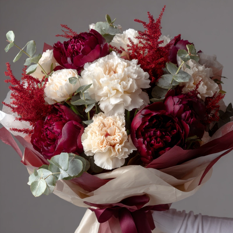 Букет с пионами «Рубиновая вуаль»