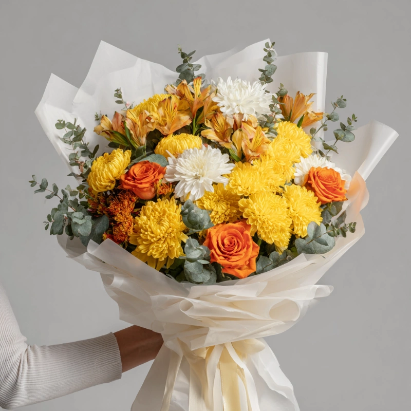 Тёплый и уютный букет, в котором собраны самые насыщенные оттенки осени — от желтого до золотистого. Хризантемы дарят атмосферу уюта и мягкого света, как октябрьский закат. Подходит для поздравлений и осеннего настроения.