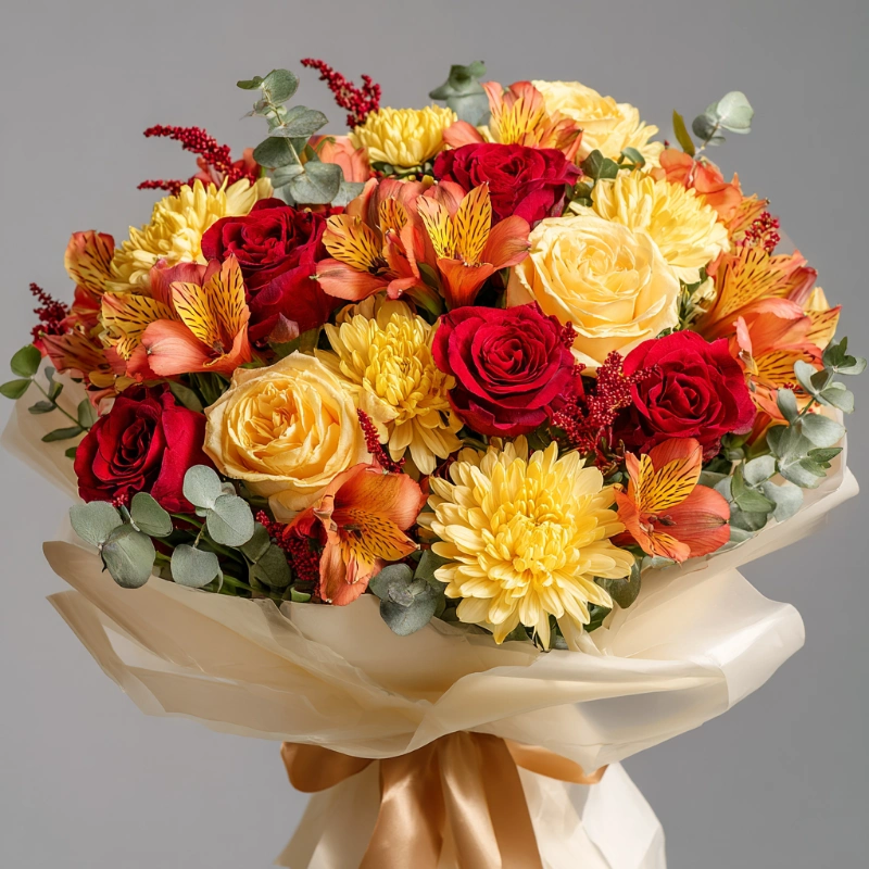 Глубокие, насыщенные оттенки этого букета напоминают о первых холодных вечерах и тёплых шарфах. Хризантемы в нём — как живые огоньки сентябрьского вечера. Стильно, сдержанно и по-осеннему уютно.