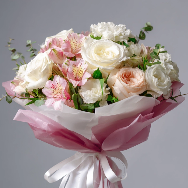 Трепетный, «припудренный» букет с эустомами в нежной палитре. Его выбирают те, кто хочет подчеркнуть деликатность и тонкость чувств. Эстетичный подарок, который останется в сердце.