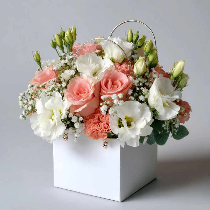 Миниатюрная композиция в изящной сумочке — утончённый способ выразить симпатию или благодарность. Идеальный подарок, который дополнит стиль получательницы.