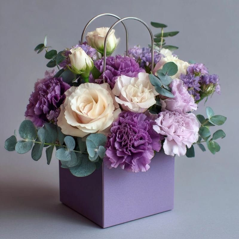 ГлавнаяКаталогКомпозицииВ сумочкахЦветы в сумочке «Модный аромат»