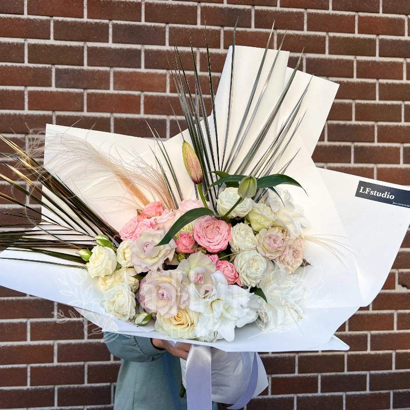 Букет «Элегантный шедевр» - это изящное сочетание белых и розовых роз, дополненное эффектными акцентами из листьев и сухоцветов. Нежные оттенки цветов и строгие линии упаковки создают стильный и современный образ. Идеальный выбор для особого случая или выражения искренних чувств.