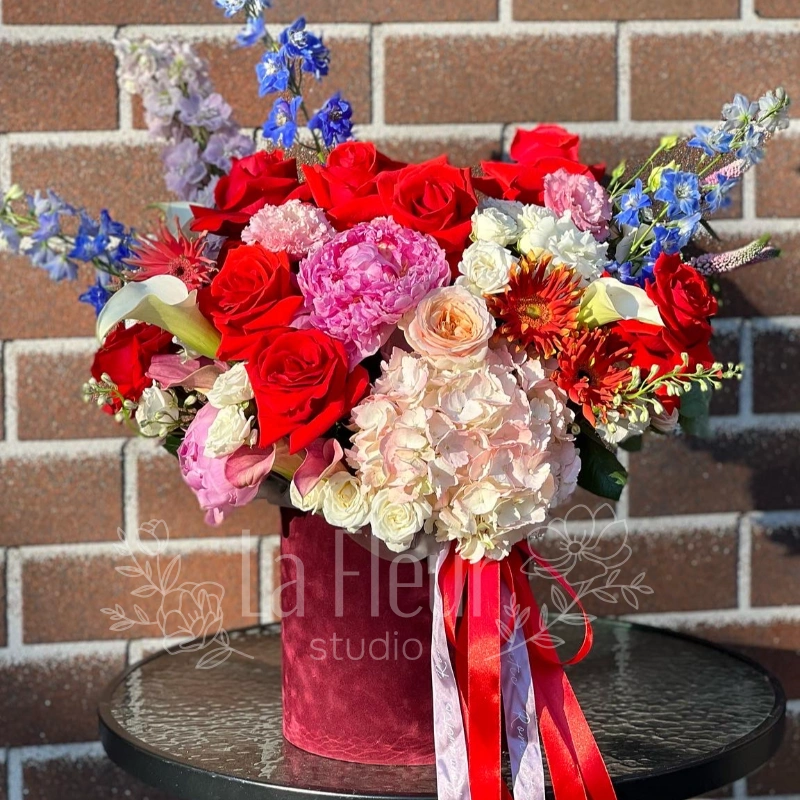 Букет «Романтика» - это роскошное сочетание красных роз, нежных пионов и белых гортензий, создающее неповторимый образ любви и изящества. Дополненный воздушными дельфиниумами и яркими акцентами, букет излучает тепло и элегантность. Благодаря бархатному вазону и изящным лентам, композиция становится идеальным подарком для самых дорогих моментов.