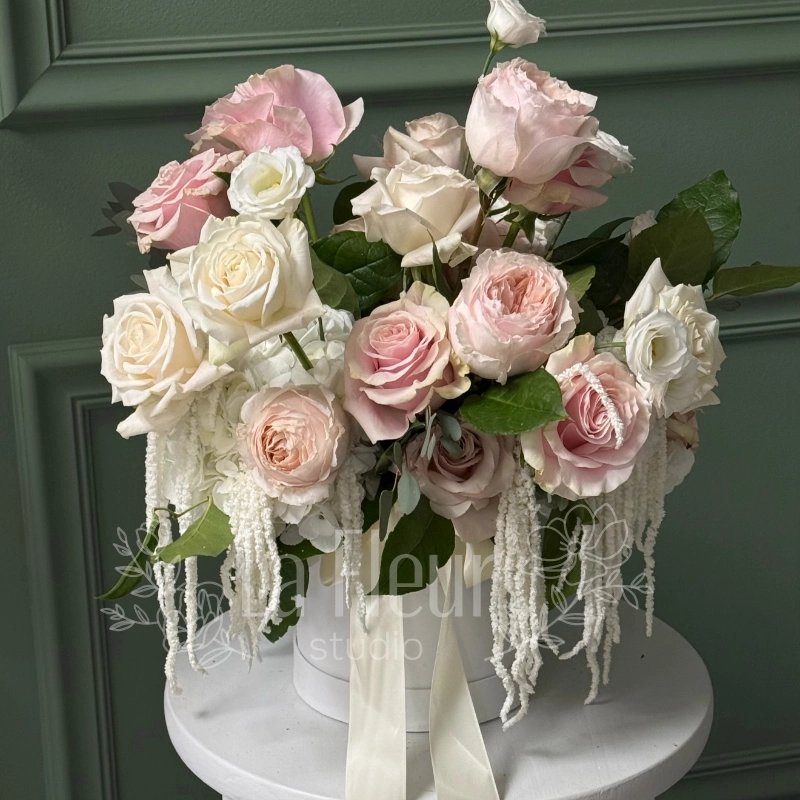 Нежный букет с изящными розами и амарантом в пастельных тонах станет прекрасным выражением любви и элегантности. Деликатные оттенки белых и розовых цветов в сочетании с длинными лентами создают романтичный и изысканный образ. Этот букет идеально подойдёт для особенного момента или в качестве изысканного свадебного аксессуара.