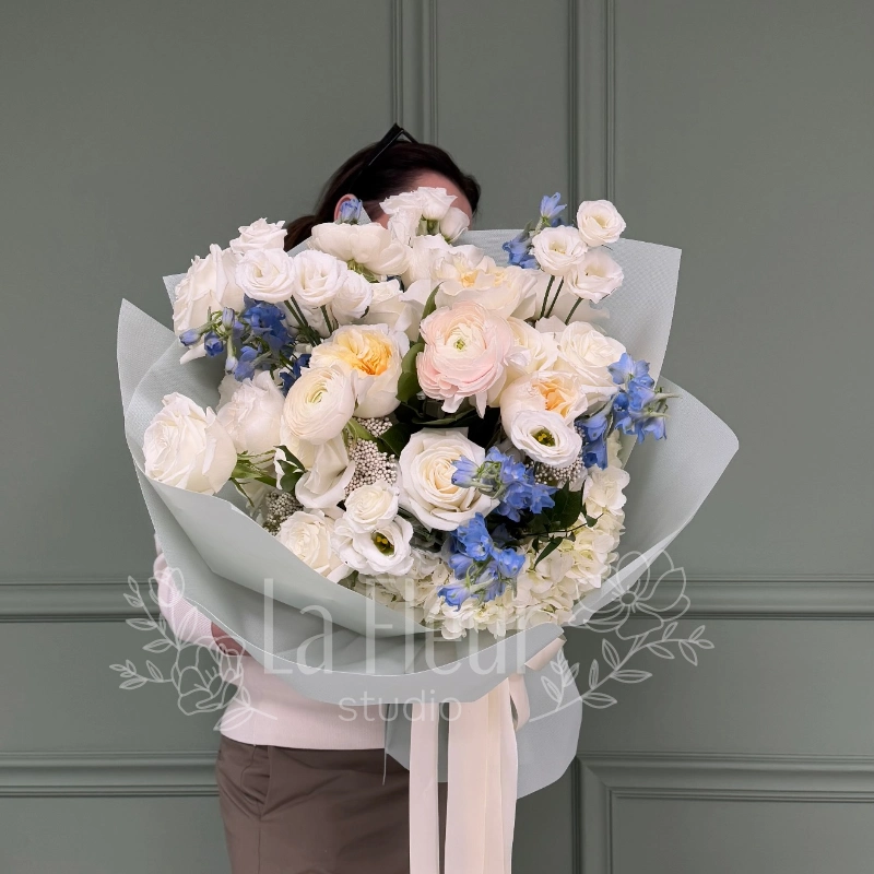 Этот прекрасный букет украшен нежными белыми розами, ранункулюсами и гортензиями, дополненными изящными голубыми дельфиниумами. Композиция излучает свежесть и элегантность, создавая уютную и романтичную атмосферу. Идеальный выбор для особого случая или просто чтобы поднять настроение.