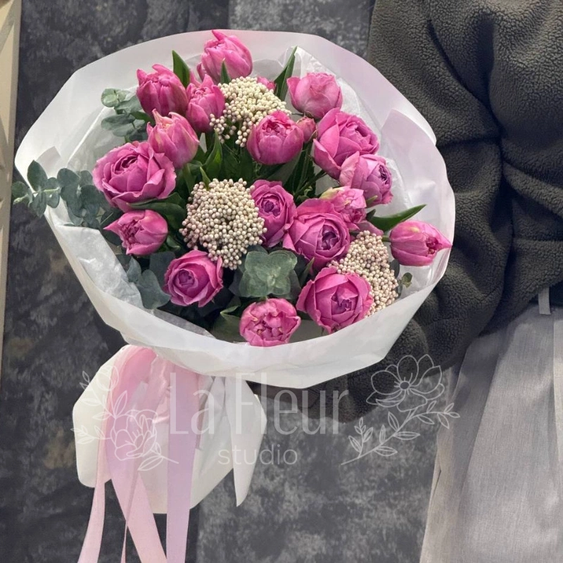 Этот букет цветов напоминает о первых лучах солнца, пробивающихся сквозь утренний туман. Нежные розовые розы символизируют пробуждение и начало нового дня, а белые цветы добавляют композиции легкость и свежесть. Букет «Розовый рассвет» идеально подходит для выражения нежных чувств и восхищения, он станет прекрасным подарком для тех, кто ценит красоту и гармонию природы.