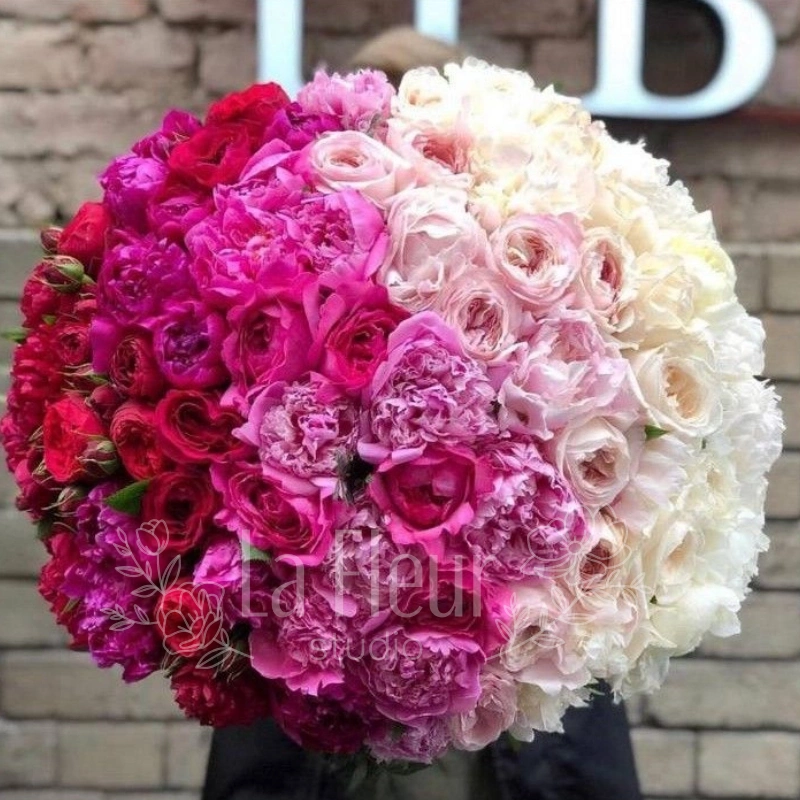 Идеальное флористическое омбре. Букет ‘Ombré Éclat’ — это мастер-класс по цветовому переходу от насыщенного карминного до сливочно-белого. Использование густомахровых сортов (пионов или садовых роз) гарантирует максимальную текстуру и долговечность. Эффектное и современное решение для тех, кто ценит смелый, но гармоничный дизайн