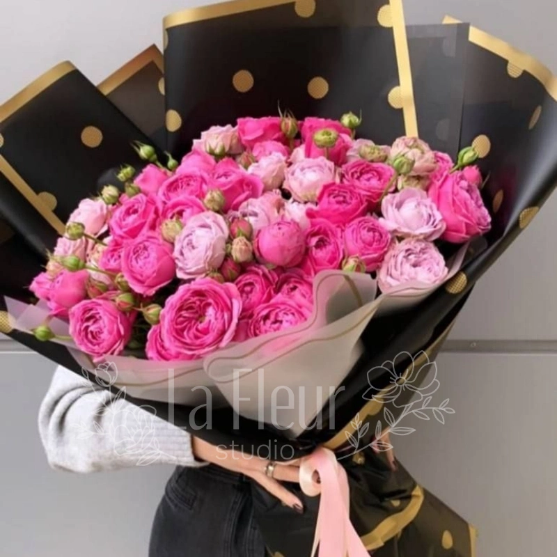 Этот объемный букет состоит из роз нежных и ярких оттенков розового, создающих эффект многослойного тающего десерта. Миллионы лепестков, обернутых в стильный черный флер, делают этот подарок невероятно запоминающимся