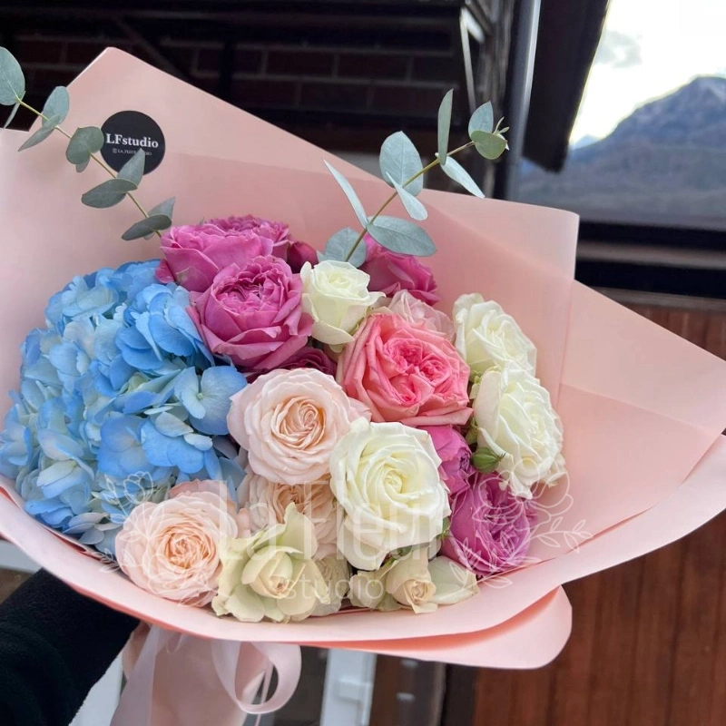 Букет «Ванильное небо» создаст атмосферу нежности и красоты. В его составе собраны цветы, которые придают композиции свежесть и воздушность. Кустовые розы дарят ощущение уюта и романтики, а пионовидные розы добавляют богатство и пышность. Гортензия дополняет букет своими крупными, нежными соцветиями. Этот букет идеально подойдет для особых случаев и в качестве приятного подарка. Цветовая гамма в мягких ванильных и пастельных тонах создает ощущение тепла и спокойствия. «Ванильное небо» станет символом искренних чувств и хорошего настроения.