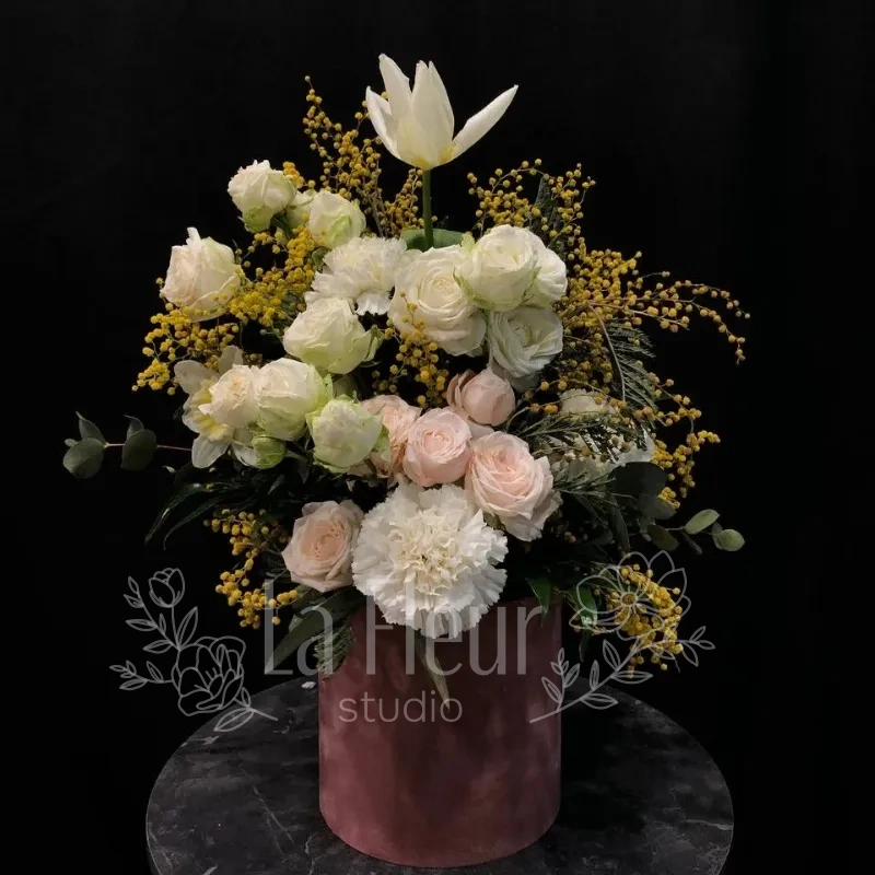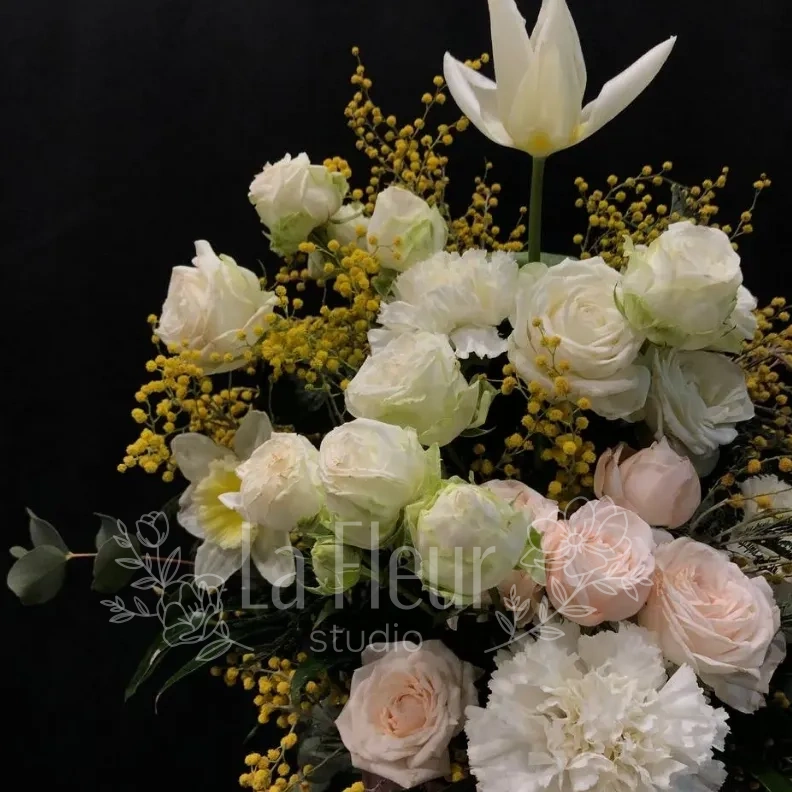 Цветочная композиция «Нежное сияние» — это гармоничное сочетание ярких и мягких оттенков, создающее атмосферу уюта и радости. В ней аккуратно объединены гвоздика, эвкалипт, мимоза, роза, кустовая роза и тюльпан, что придает ей особую изысканность. Эта композиция идеально подойдет для подарка или украшения любого интерьера. Оживите свой дом или подчеркните важное событие с помощью нежных и выразительных цветов «Нежное сияние».
