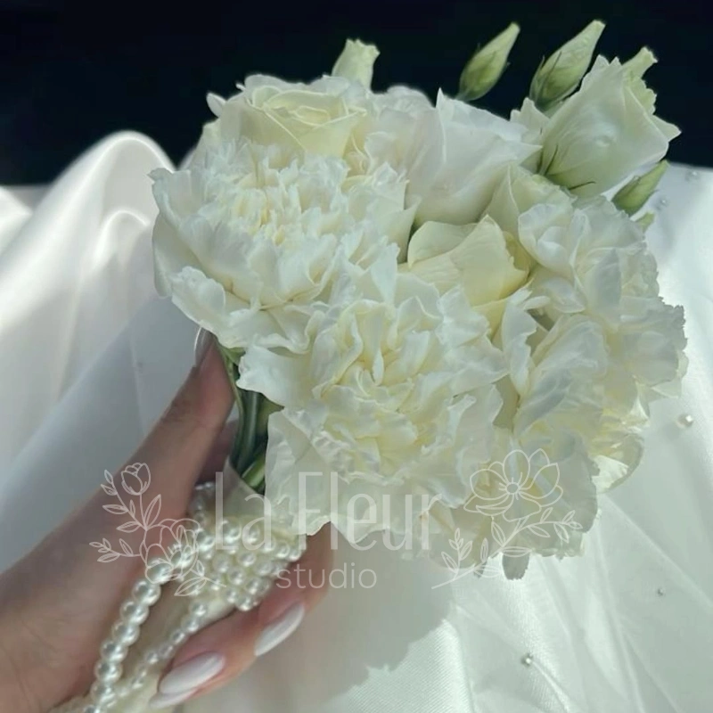 Нежный свадебный букет из эустом, словно утренний туман, создаст атмосферу изысканной романтики. Белоснежные или кремовые лепестки эустом, трепетно раскрывающиеся навстречу друг другу, символизируют чистоту и вечную любовь. Этот элегантный букет станет идеальным дополнением к вашему образу в самый важный день.