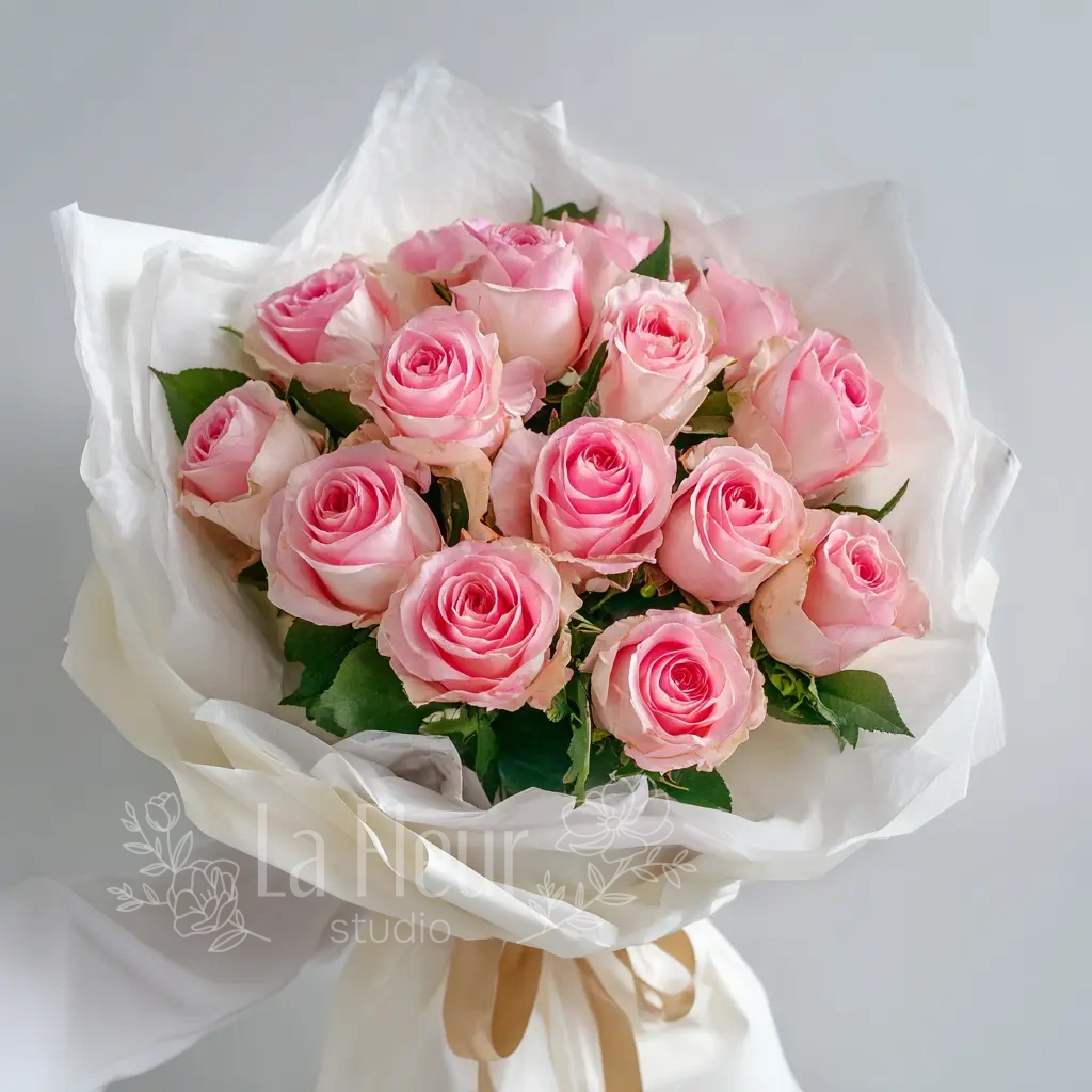 Элегантный букет из 15 розовых роз с крупными бутонами. Эквадорские сорта славятся своей стойкостью и внешним видом — подарите утончённость и заботу в одном букете.