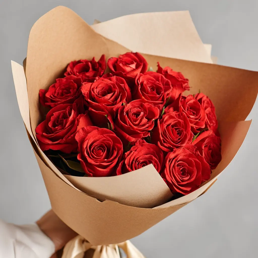 Компактный, но выразительный букет с 15 алыми розами из Кении. Их бархатистые бутоны и насыщенный оттенок делают букет запоминающимся акцентом на любом празднике.