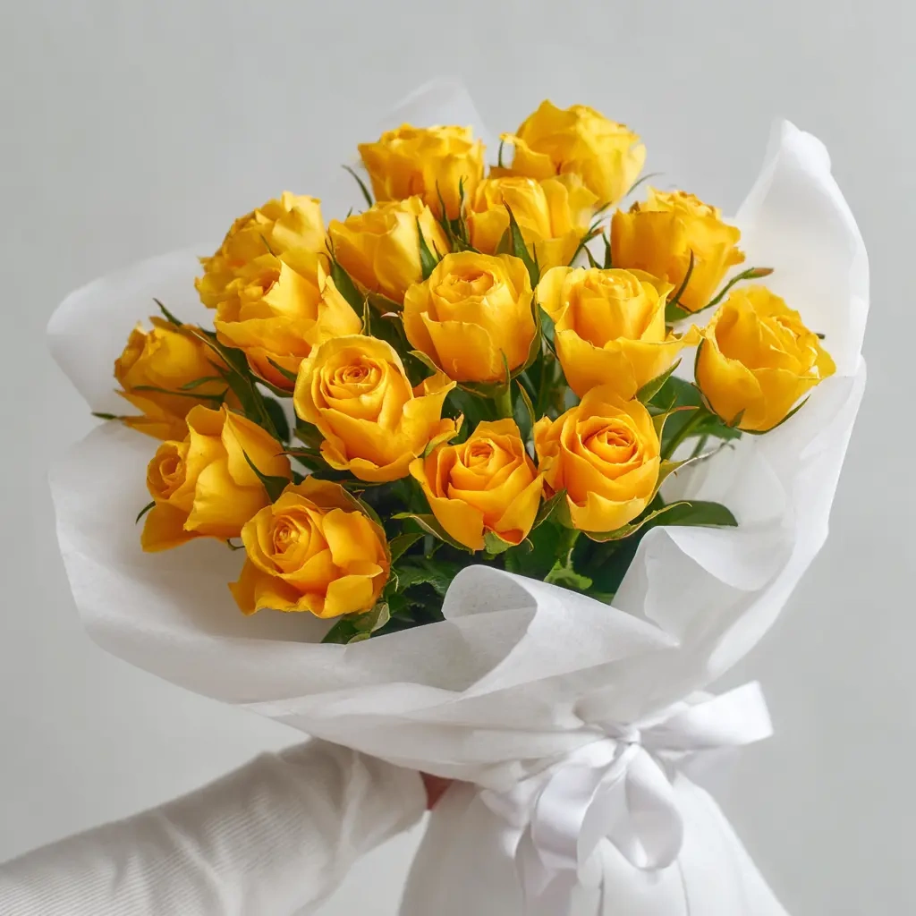 Яркий, солнечный букет из 15 жёлтых роз длиной 40 см. Символ радости, дружбы и позитива. Кенийские розы в этом исполнении станут отличным подарком коллеге, подруге или близкому человеку.
