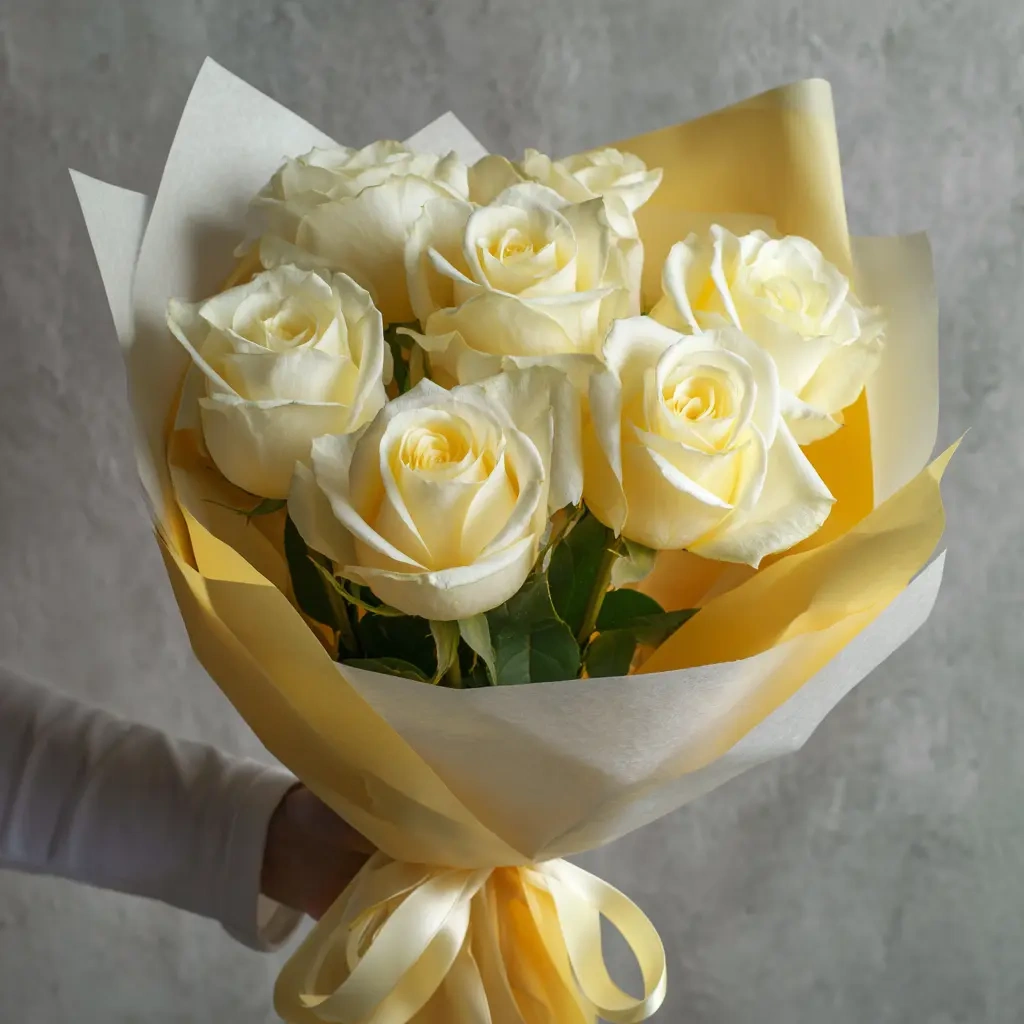 Роскошный букет, в котором белые розы сияют как благородное золото. Подойдёт для важных событий, деловых поздравлений или элегантного подарка. Совмещает утонченность и статусность.